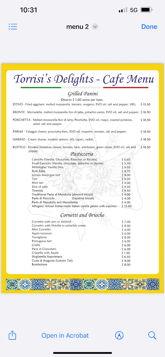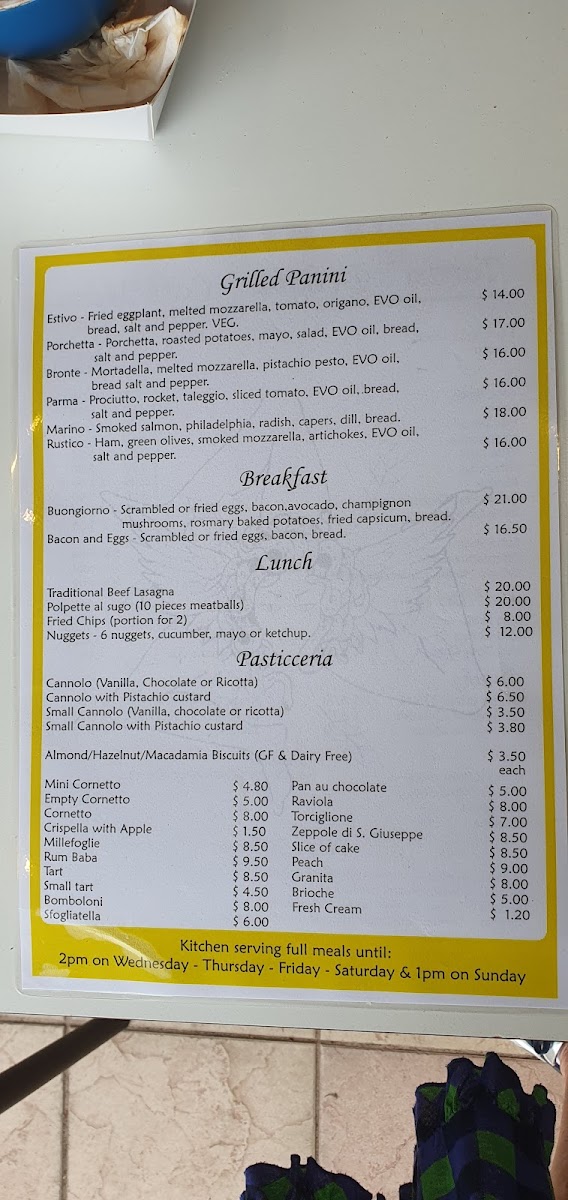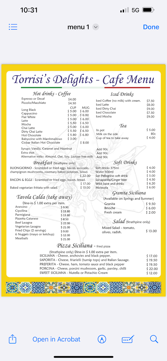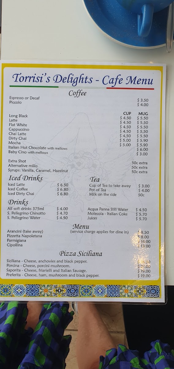 The menu at Torrisi's Delights Pty Ltd offers a variety of Italian-inspired options suitable for breakfast, light meals, and coffee breaks. The selection includes sweet and savory pastries, hot food items, and a range of beverages. This menu is structured to cater to different dining preferences, whether for a quick order or a casual sit-down experience.